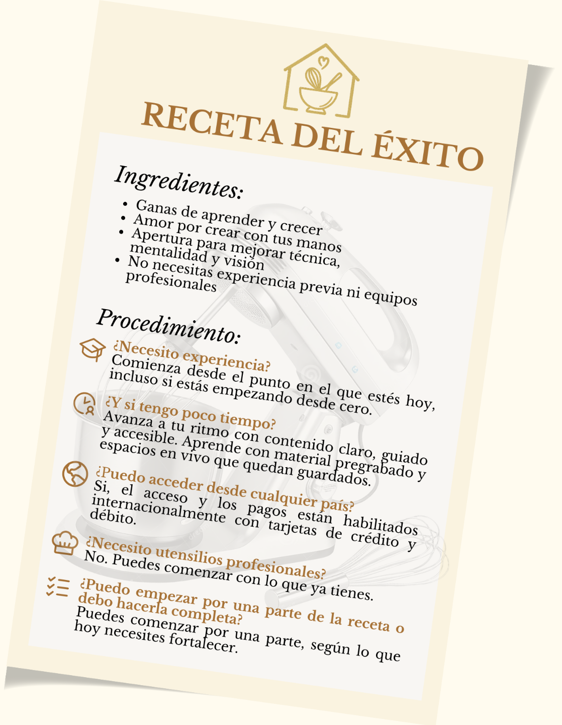 ✓ Amas crear postres, tortas o panes, pero sientes que aprenderlo todo bien es más complicado de lo que imaginabas.